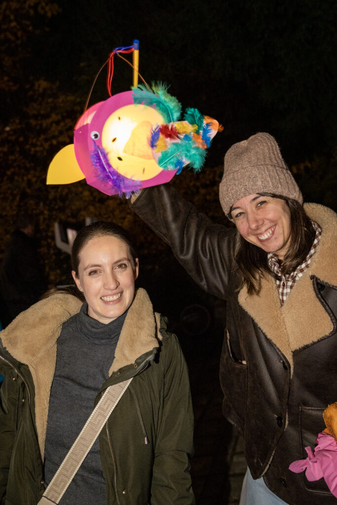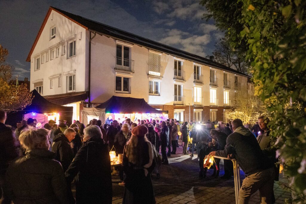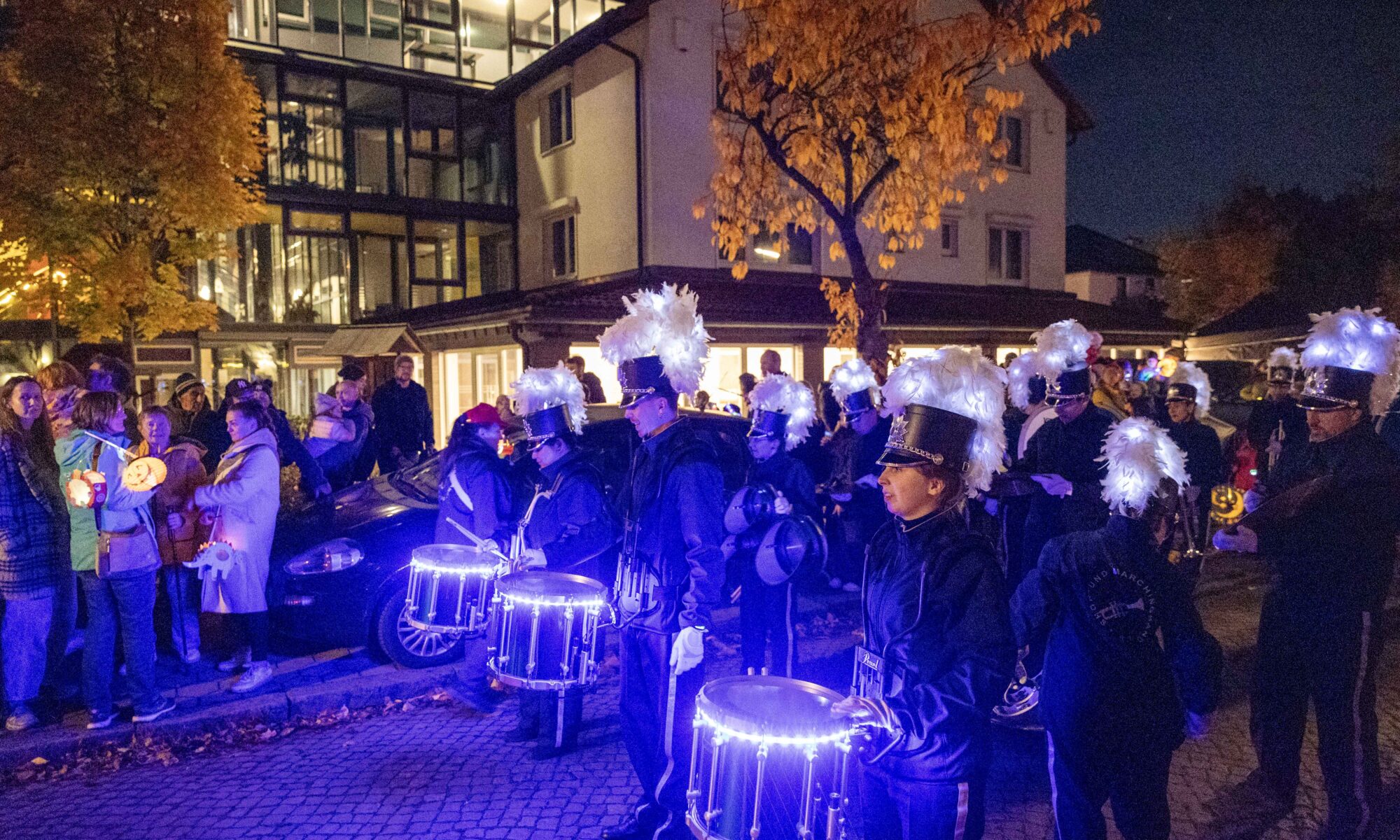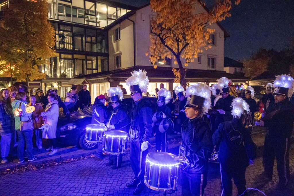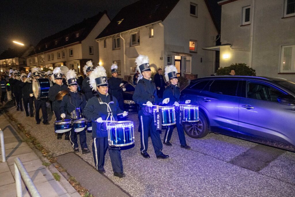 Etwa 300 Mitglieder, Nachbarinnen und Nachbarn kamen zum Laternenumzug der WGW am 4. November 2025 Nach dem Aufwärmen mit Würstchen, Kinderpunsch und Glühwein ging es durch die Gartenstadt − begleitet von der Show- und Marchingband 2000.