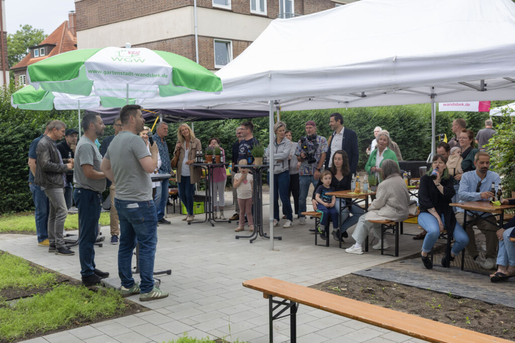 Plopp! Plopp! Plopp! Finn Masurek klopft auf das Handmikro. Für einen Moment unterbrechen er und sein Kollege Florian Horstmann aus dem technischen Mieterservice die angeregten Gespräche. Aber sie haben den besten Grund. Beide haben den Umbau und die Mitglieder eng begleitet. „Wir wissen, dass es nicht leicht für unsere Mitglieder war. Deshalb: Danke, dass Sie alle so toll mitgezogen haben.“ Dass es sich so richtig lohnt, werden die Bewohnerinnen und Bewohner wohl erst in den kommenden Jahren merken. Drei Wärmepumpen versorgen Heizung und Warmwasser, die Gasheizung unterstützt nur noch zu Spitzenzeiten, und eine Photovoltaikanlage produziert grünen Strom.