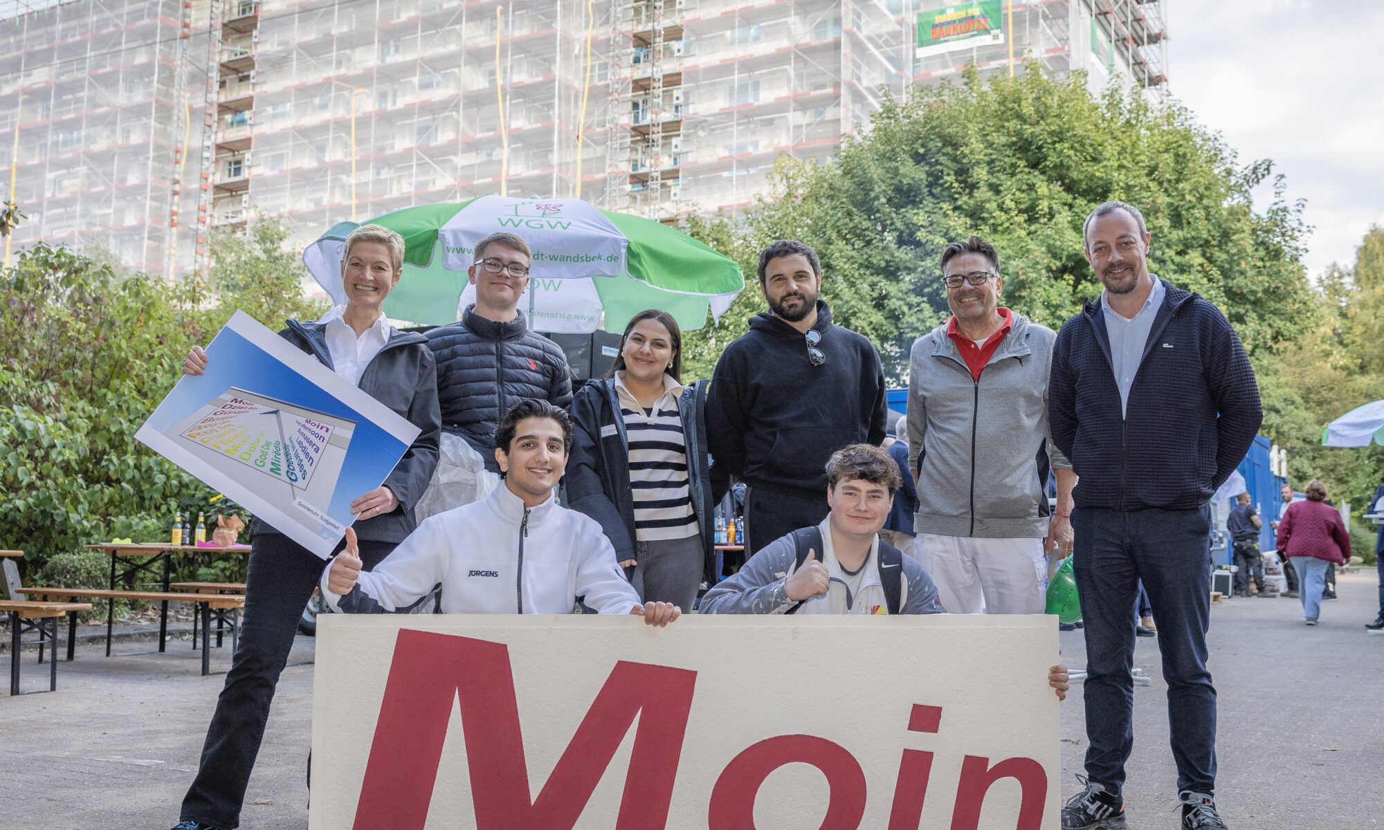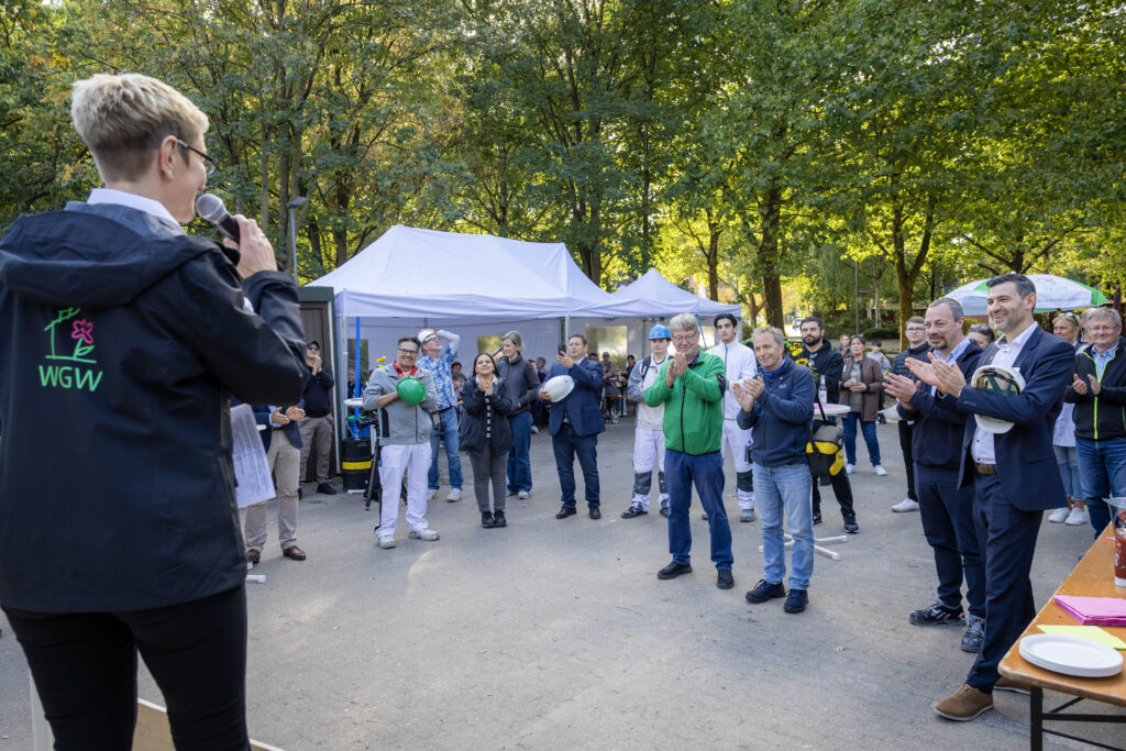Info-Stand, Grillstation, einladendes Zelt mit Tischen und Bänken: Die Kulisse erinnerte an ein kleines Richtfest, zu dem die Bewohnerinnen und Bewohner sowie Projektbeteiligte eingeladen waren. Und das hatte einen guten Grund. „Der erste große Bauabschnitt unserer Modernisierung ist geschafft, und wir bedanken uns bei unseren Mitgliedern für ihre Geduld, ihr Verständnis und ihre Unterstützung“, eröffnete Vorstandsvorsitzende Christine Stehr in ihrer Begrüßung.
