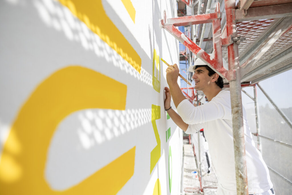 Für Necirwan Hakbilen (Foto unten) hingegen wird genau das irgendwann zu seinem Berufsbild gehören. Der 22-Jährige macht beim Hamburger Malereibetrieb Hubert Jürgens eine Ausbildung in Energieeffizienz und Gestaltungstechnik – ein neuer Berufszweig. Im Norden ist er bislang der Einzige, für die Berufsschule muss er nach Frankfurt. „Ich bin der Pilot-Azubi.“ Das Sonnenuhr-Projekt passte perfekt zu seiner Ausbildung, trotzdem war er überrascht, dass er mitmachen durfte. „Ich habe erst vor zwei Monaten angefangen“, erzählte er begeistert, „und ich bin so dankbar, dass mir mein Betrieb das ermöglicht hat.“ Insgesamt zwei Wochen waren die Auszubildenden an der Fassade im Einsatz – voller Motivation, Enthusiasmus und mit großem Talent! Und das kann man inzwischen schon von weitem sehen.