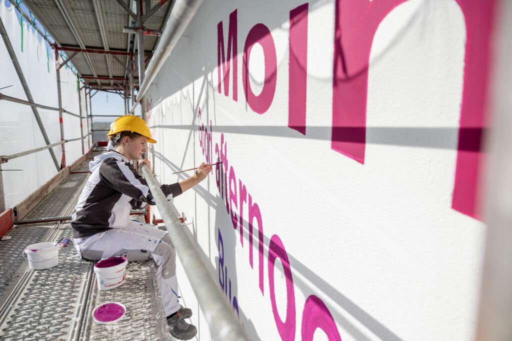 Statt Ziffern sind auf der Sonnenuhr freundliche Begrüßungsformeln zu sehen – „in Sprachen, die für unsere Mitglieder in diesem Haus eine Bedeutung haben und die in den Betrieben gesprochen werden, die tagtäglich für uns im Einsatz sind.“ Nur, wie bringt man ein solches Kunstwerk in dieser Größe und in schwindelerregender Höhe an die Wand? Das erklärte Dirk Prilipp, Farbdesigner im Brillux-Farbstudio Hamburg, den Auszubildenden ausführlich anhand einer Grafik. Unter den aufmerksamen Zuhörerinnen und Zuhörern war auch WGW-Auszubildende Elham Hassansadeh (Foto unten). Bei angehenden Immobilienkaufleuten stehen solche Arbeiten nicht auf dem Lehrplan – gerade das machte für sie aber den Reiz aus: „Das ist so ein spannendes Projekt, diese Gelegenheit wollte ich mir nicht entgehen lassen.“