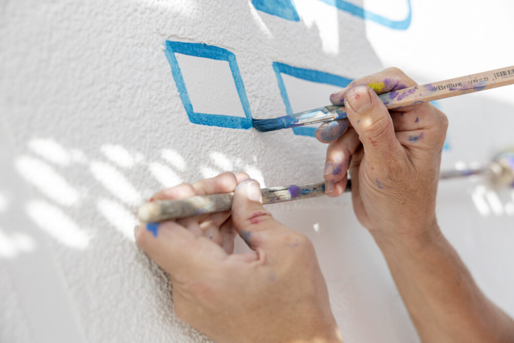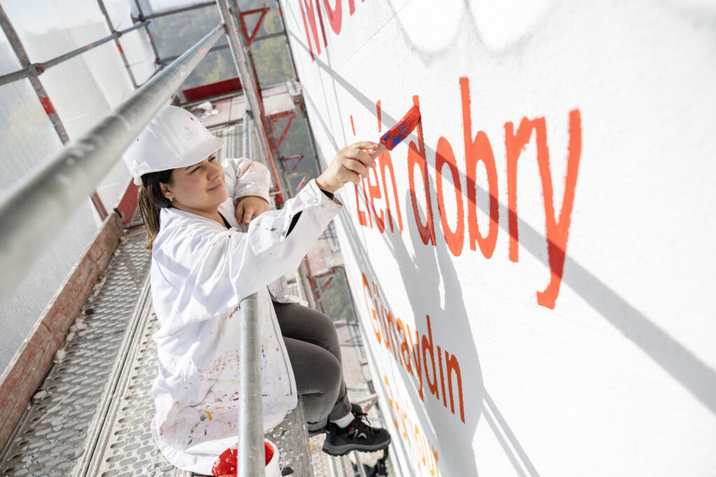 Azubis in Aktion Insgesamt beteiligten sich sieben Auszubildende aus verschiedenen Betrieben an dem außergewöhnlichen WGW-Projekt. Auch das Bauunternehmen August Prien –federführend für die Fassadenarbeiten im Rahmen der energetischen Modernisierung –brachte neben vielen Informationen zur Ausbildung im Bauhauptgewerbe zwei ihrer Auszubildenden mit, die den Künstlern interessiert über die Schulter schauten. Die Aktion war zudem Teil der Reihe „Hamburger Talente“, die Brillux Hamburg vor einigen Jahren ins Leben gerufen hat. Ziel ist es, Nachwuchskräfte zu fördern, ihnen die Möglichkeit zu geben, ihr Können zu zeigen – und ihnen Erfahrungen zu bieten, die im Ausbildungsalltag selten sind. „Im Handwerk gibt es so coole Berufe“, meinte Andreas Weißling, technischer Berater bei Brillux. „Das muss man auch einmal zeigen.“